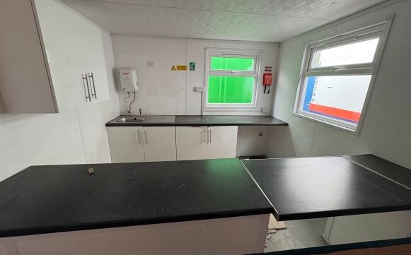 Open plan office with a canteen to one end, partitioned off with a serving counter currently (can be removed).