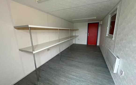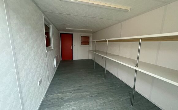Open plan office layout without racking to one side. Steel doors to both gable ends.