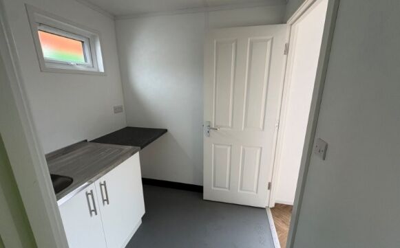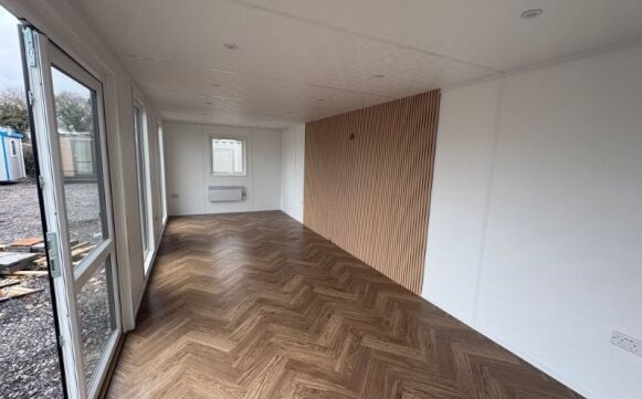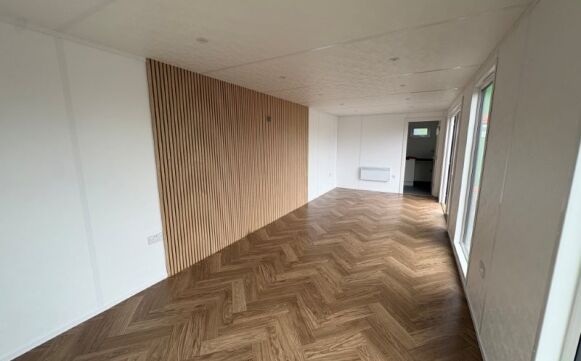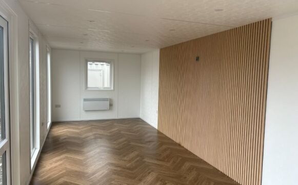 Open plan office area with internal wall panelling and single socket for wall mounting.